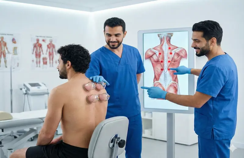 تُجرى باستخدام الزيوت الطبية مع تحريك الكؤوس على الجلد، وتفيد في إرخاء العضلات، تخفيف الشد العضلي، وتحسين مرونة الأنسجة، وغالبًا ما تُستخدم كجزء من الخطة العلاجية المتكاملة.